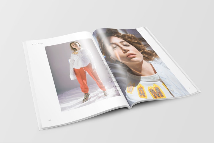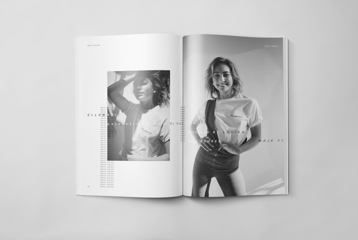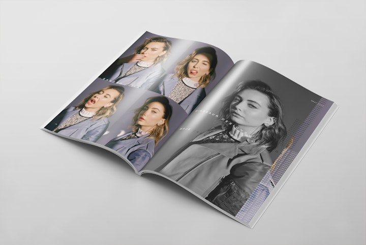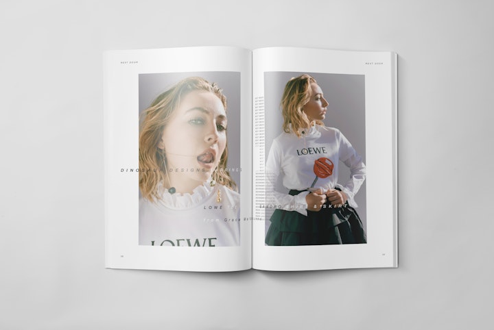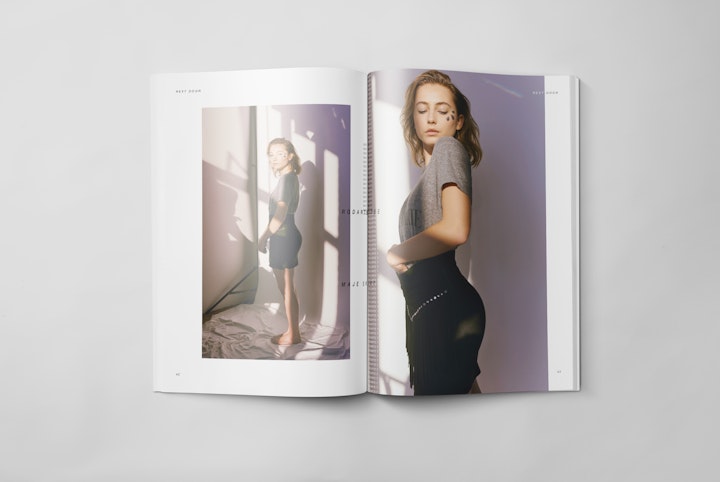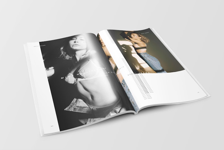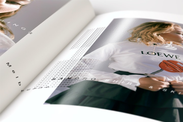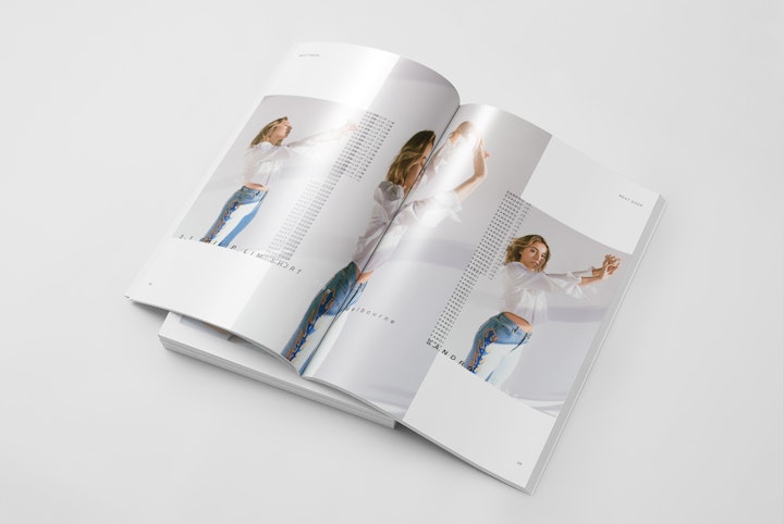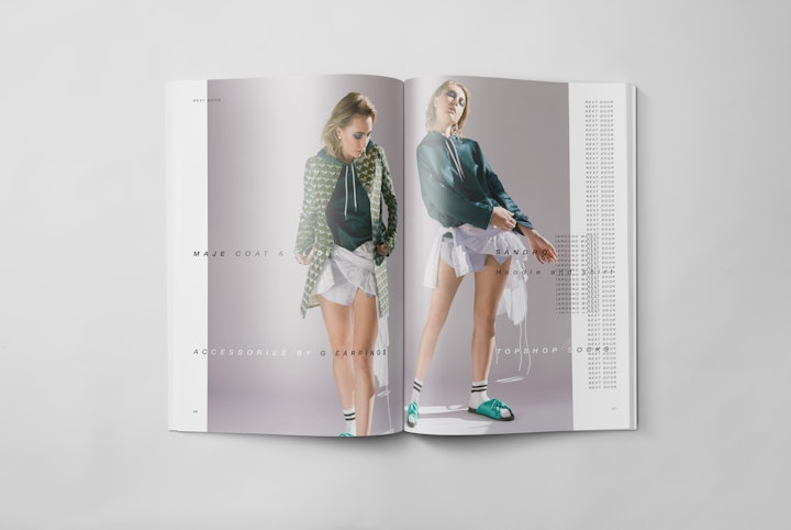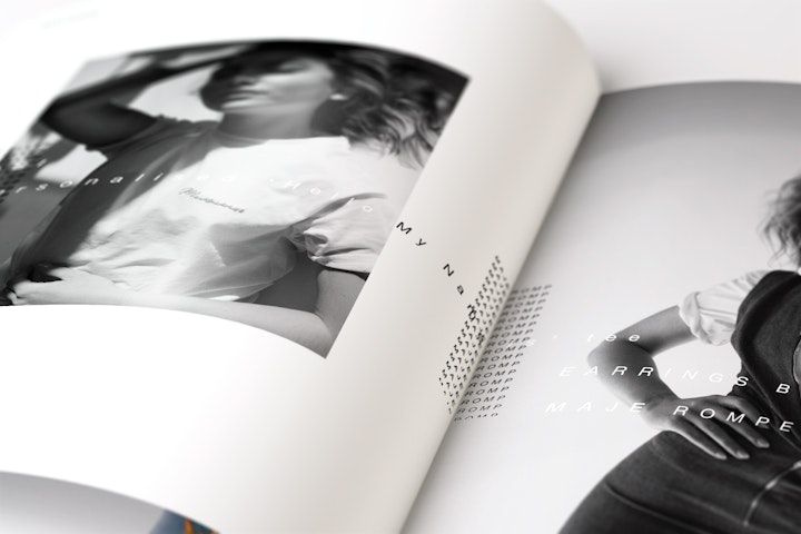 Strict 6x6x9 SPS grid with oversized wardrobe credits across each spread. The continually repeated and offset placement of typographic patterns (both within, and across spreads) gives emphasis to the often downplayed clothing credits; both disrupting the traditional fashion photo story treatment, and providing a structure with which to validate the photograph subject beneath.